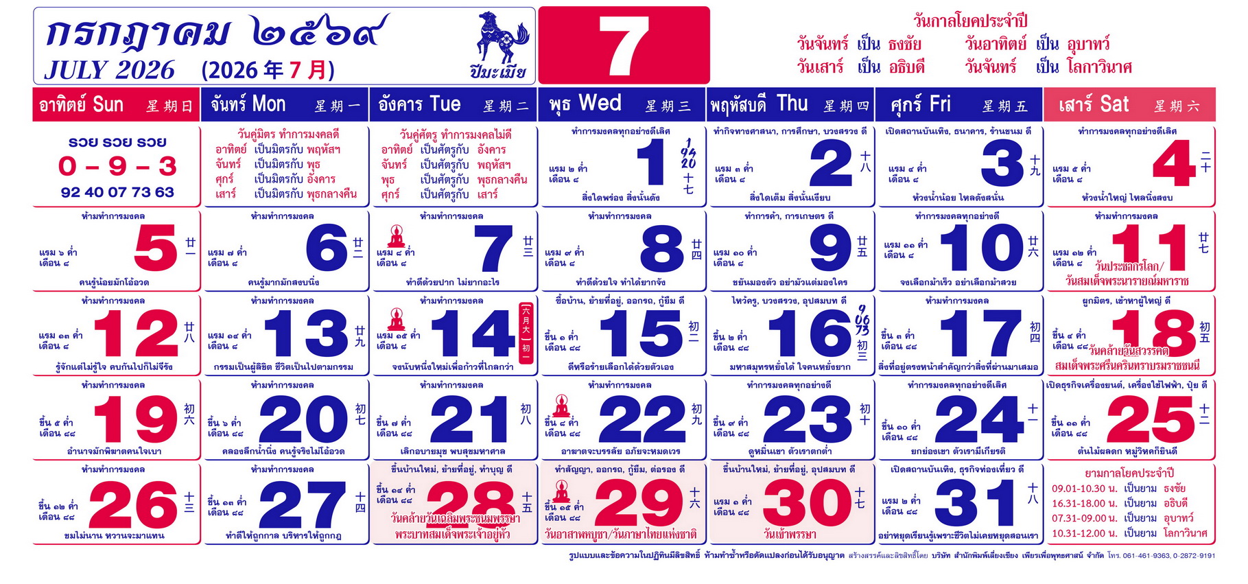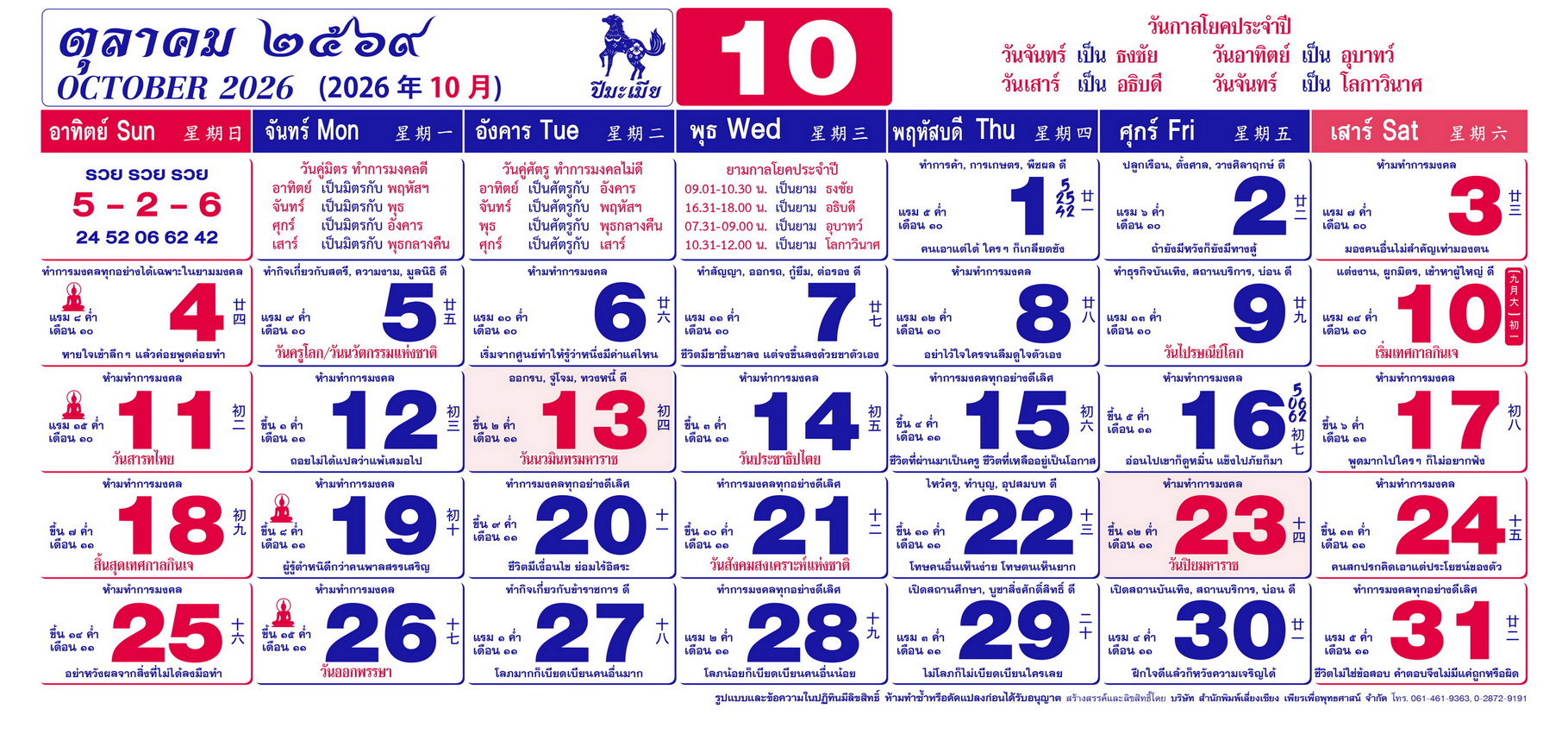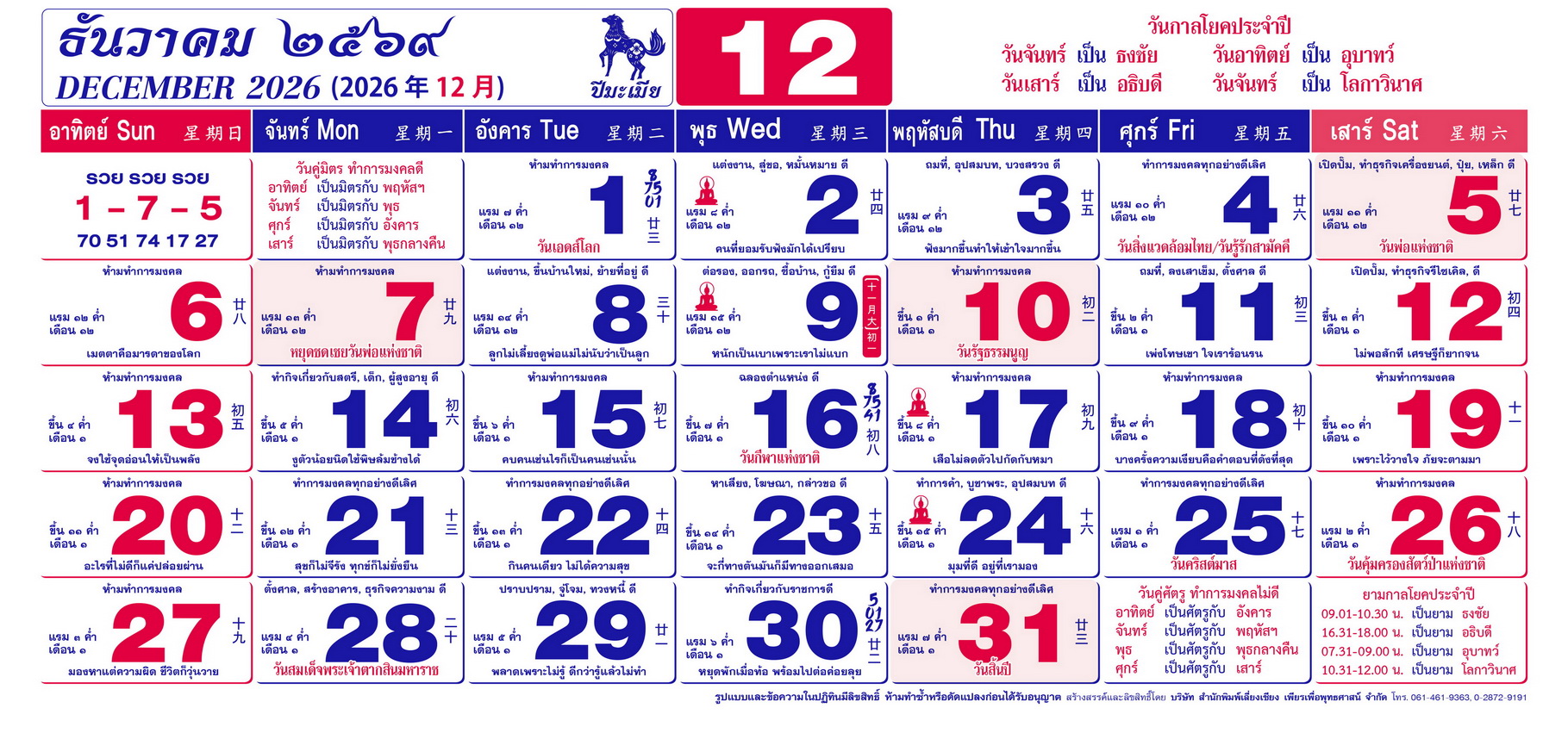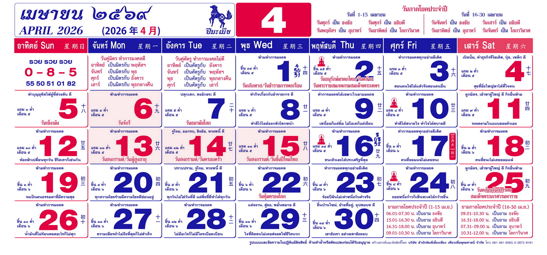 เนื้อหาปฏิทิน ฤกษ์งามยามดี 2569